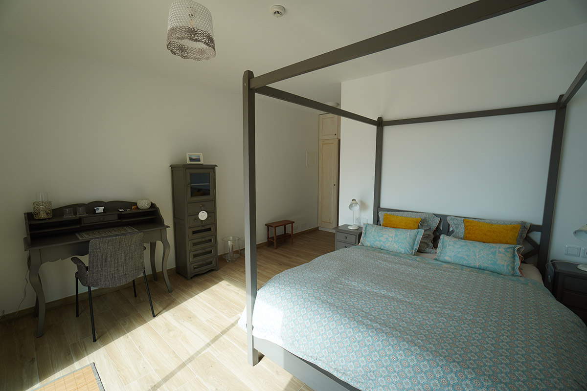 Si vous aimez l’enchantement, vous tomberez amoureux de notre «Vista». Magnifiquement aménagée et offrant une vue à couper le souffle jusqu’à l’horizon, cette chambre (25 m²) vous permet de vivre vos rêves. Depuis votre lit Queen Size à baldaquin, admirez les lumières scintillantes de la côte et laissez-vous envoûter par la lueur argentée de la lune qui baigne la mer. À côté, sur le joli secrétaire, vous pourrez immortaliser vos expériences en mots et en images. La salle de bains élégante est équipée d’une baignoire moderne, parfaite pour la détente. Une terrasse privée, juste au bord de la piscine, complète cette offre. Entrez dans le pays des merveilles et réservez dès aujourd’hui notre «Vista».